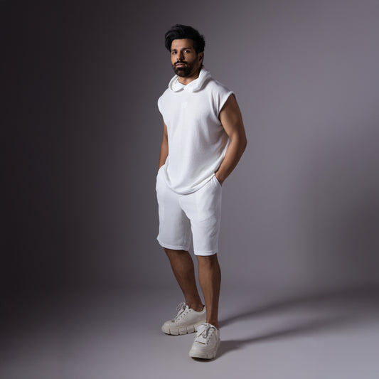 WHITE SLEEVELESS HOODIE & SHORTS CO-ORD SET