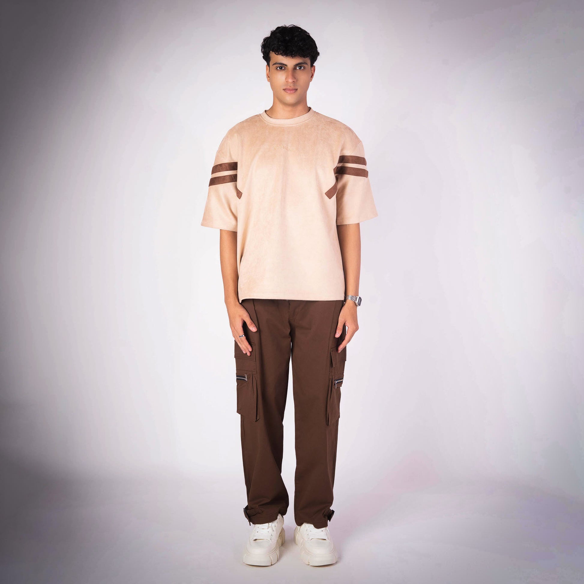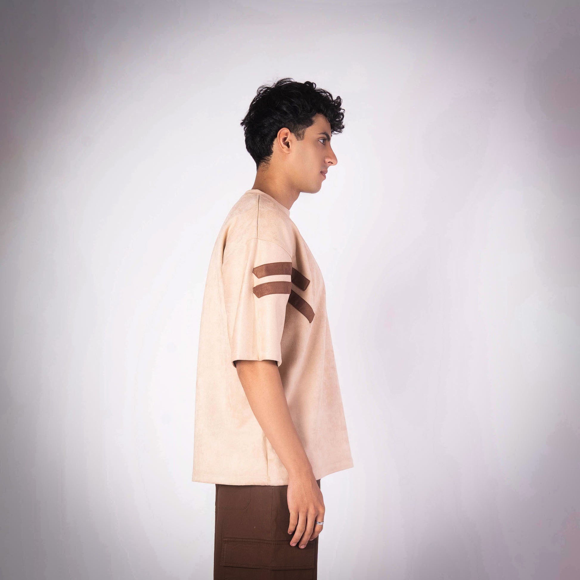 An Updated Version To Our Classic Suede Embroidered T-shirts. This T-shirt Is Beautifully Crafted With The Details Of Contrast Stripes On The Shoulder. The T-shirt Is Constructed In A Oversized fit With Minimal Embroidery Details On This Lustrous Fabric In The Front Giving That Extra Touch Of Elegance. An Experimental T-shirt That Will Elevate Every Look Making It A Statement T-shirt To Your Collection.